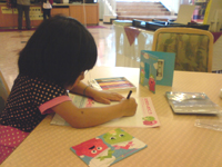 大人しくしてもらうため、プリキュアのシールブックを持参させた。