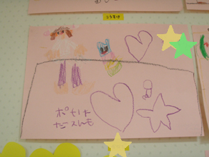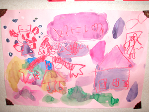 ピンクの用紙に、赤いクレヨンで描き
