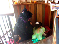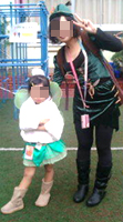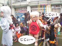 このよく分からない仮装の親子と、帯がハロウィン仕様な奥様
