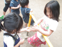保育園にお迎えに行って、先生と園庭でサヨウナラの挨拶をした。