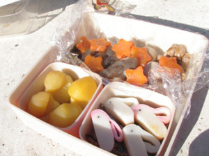 お煮しめ、かまぼこ、田作り、栗きんとん。