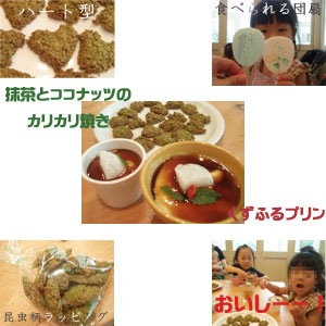 先生が抹茶とココナッツファインを袋の中で混ぜようとするも、袋が小さすぎて混ぜられなかった所w