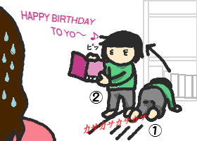 更に、無言で カサカサカサカサ と本棚へ行き、歌の絵本を取り出し『Happy Birthday』を流すタレメ。