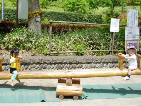 木で出来たシーソーやブランコや橋で遊ぶ。